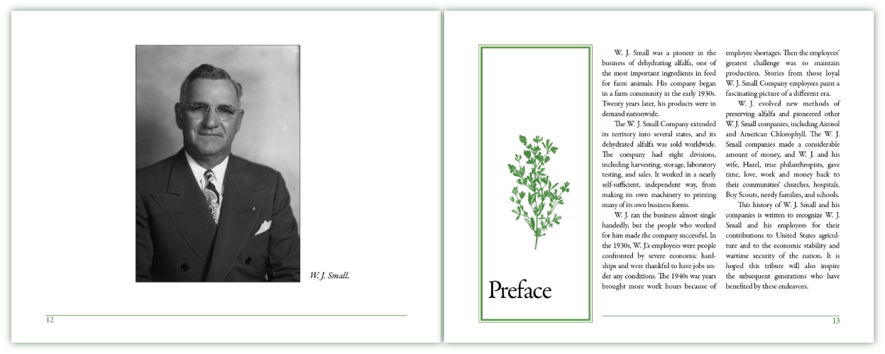 This history of W. J. Small and his companies is written to recognize W. J. Small and his employees for their contributions to United States agriculture and to the economic stability and wartime security of the nation. It is hoped this tribute will also inspire the subsequent generations who have benefited by these endeavors.